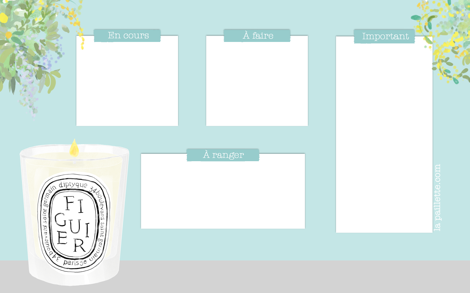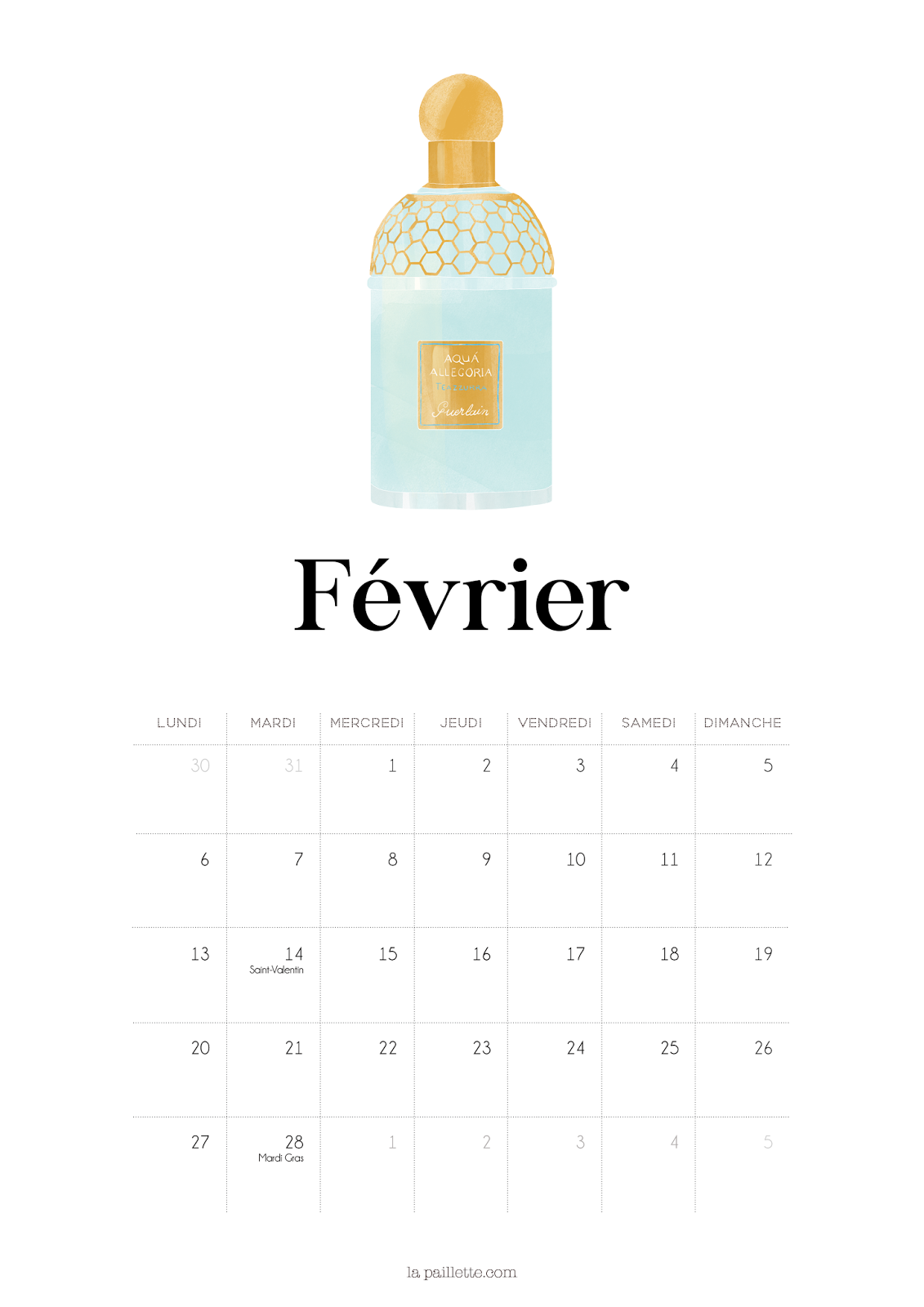 Ce mois-ci, le calendrier et le fond d’écran organisé sont accompagnés du parfum Aqua Allegoria – Teazzurra de Guerlain et d’une des célèbres bougies Dyptique. Et même si nous sommes encore en hiver, je n’ai pas pu m’empêcher d’apporter une petite touche fleurie et plus printanière (après les glaces en décembre hum hum).