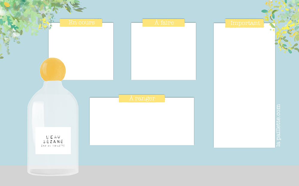 Ce mois-ci, le calendrier et le fond d’écran organisé sont accompagnés du joli flacon très épuré de l’eau Sézane, j’espère que ça vous plaira :).