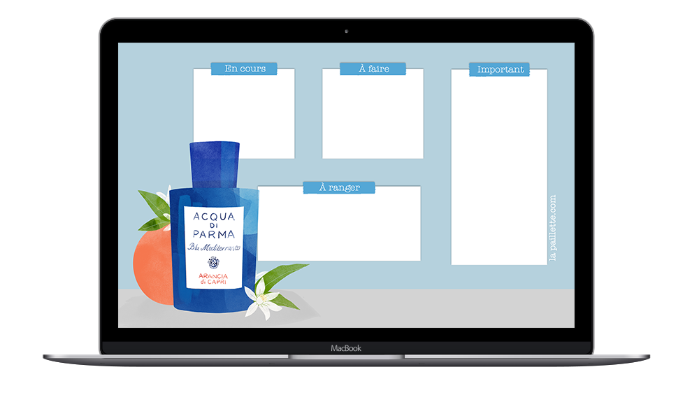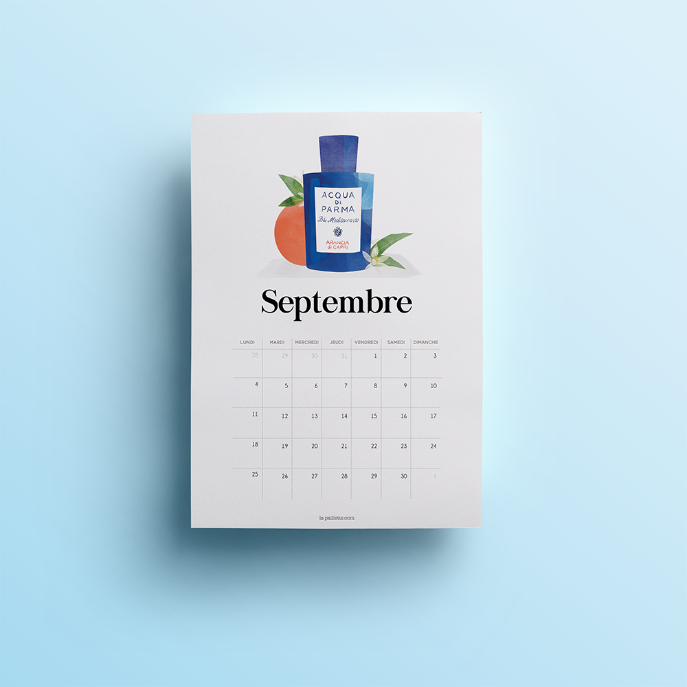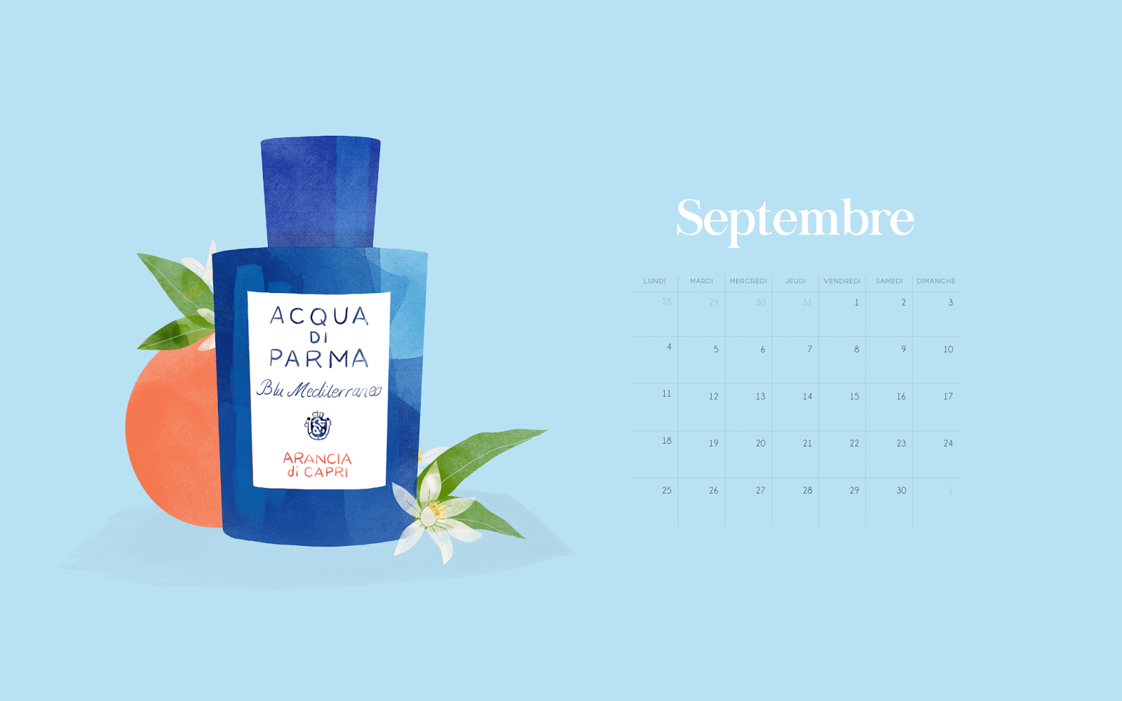 Ce mois-ci, le calendrier et les fonds d’écran sont accompagnés du flacon bleu emblématique Acqua di Parma que j’ai découvert chez Maison Orso à Rennes. J’avais envie de conserver une ambiance fraiche et estivale pour bien commencer la rentrée, j’espère que ça vous plaira :).