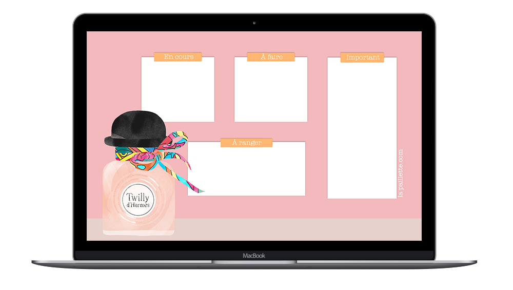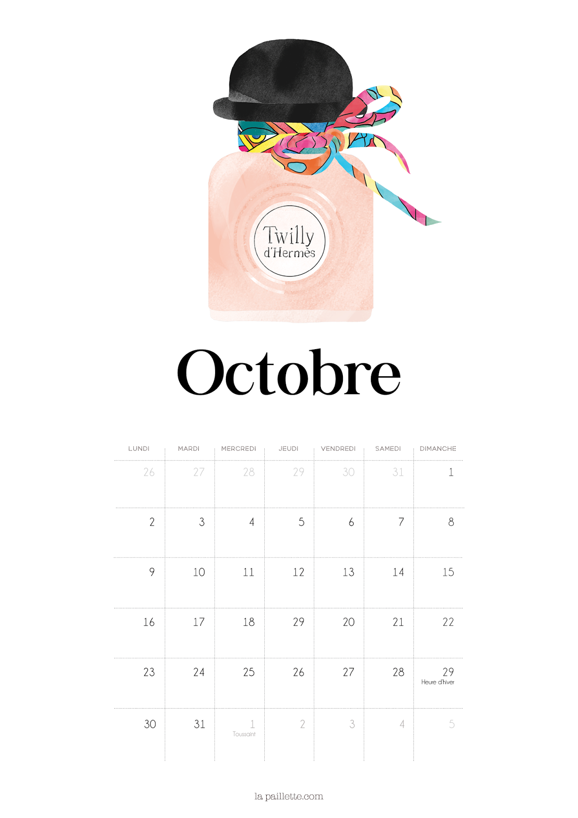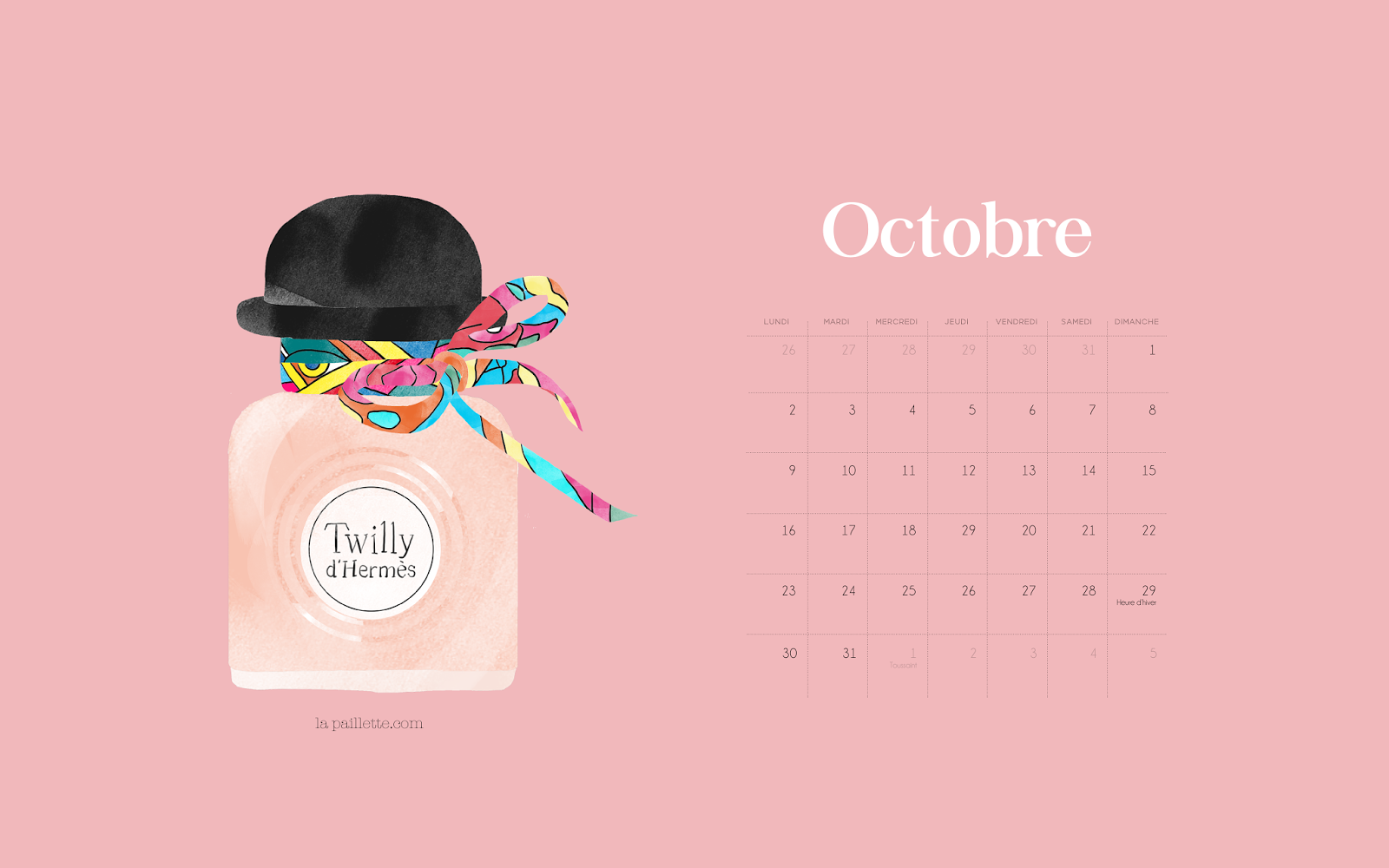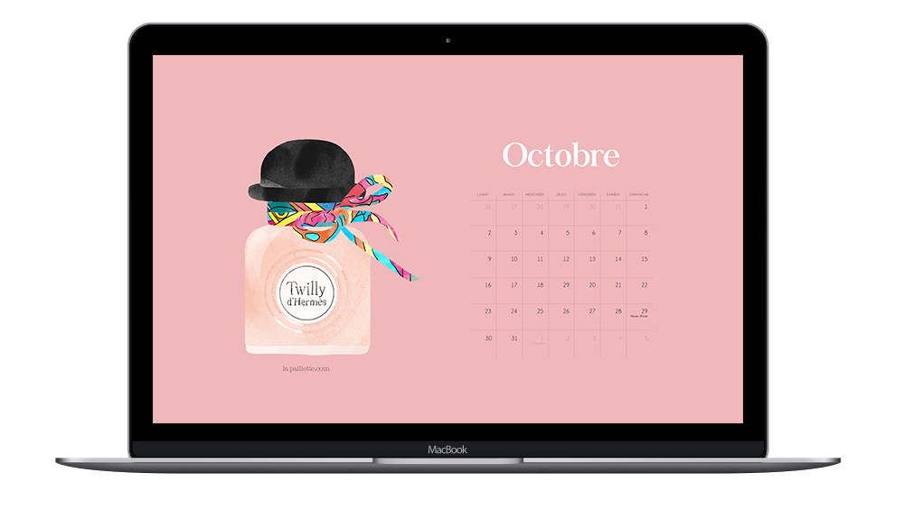 Ce mois-ci, le calendrier et les fonds d’écran sont accompagnés du tout nouveau parfum Twilly de Hermès. Je trouve qu’il change des autres flacons et j’aime bien sa forme avec son bouchon chapeau-melon. J’espère que ça vous plaira !