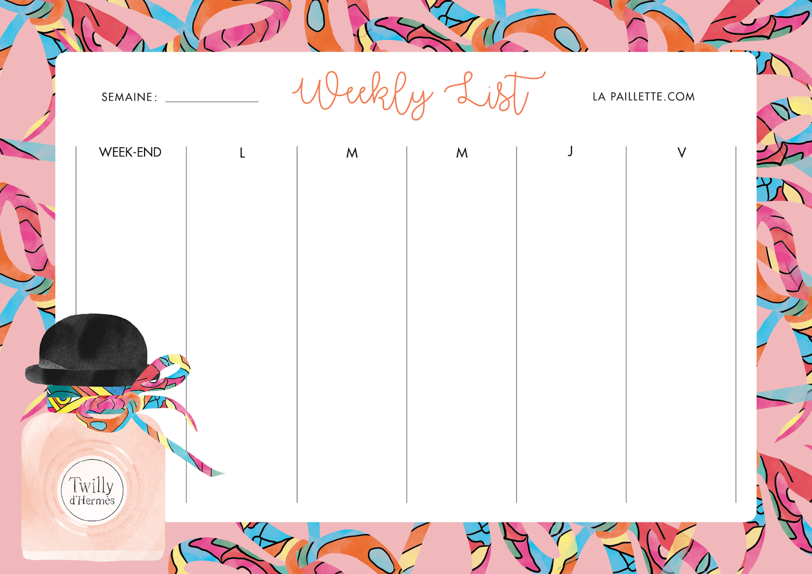 Et voilà le nouveau semainier, qui, comme pour le calendrier et les fonds d’écran, est accompagné du flacon Twilly. J’aime beaucoup ce qu’Hermès a réussir à faire niveau créa avec ce parfum, je trouve qu’ils réussissent à se démarquer des autres campagnes de pub et des autres flacons. Bref, ça change un peu et j’espère que ça vous plaira ! 🙂